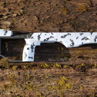 A Tikka TRG stock Cerakoted in Winter Camo with Storm Trooper White and Blackout Black